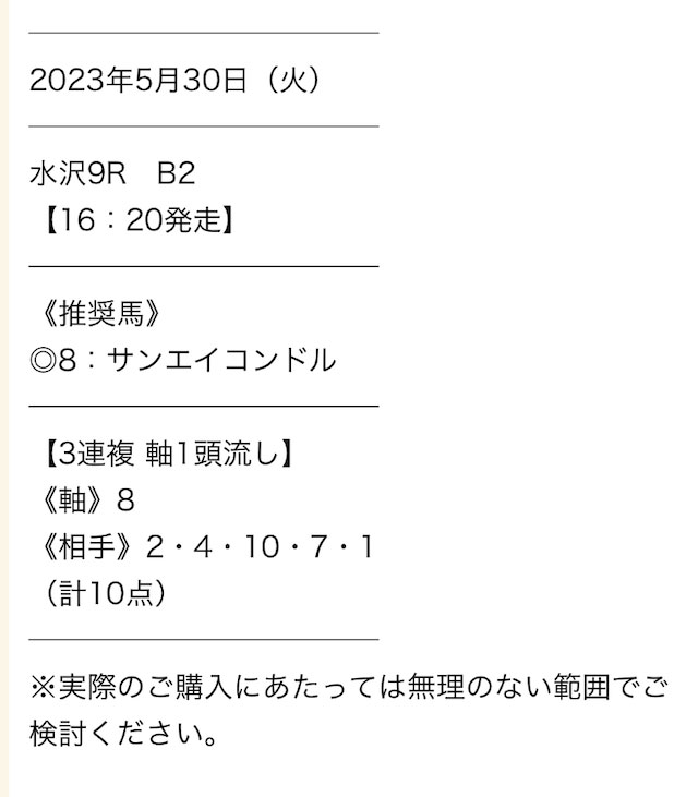 そして実際に公開されていた買い目ですが、2レース分で、まずは1レース目がこちらになります。