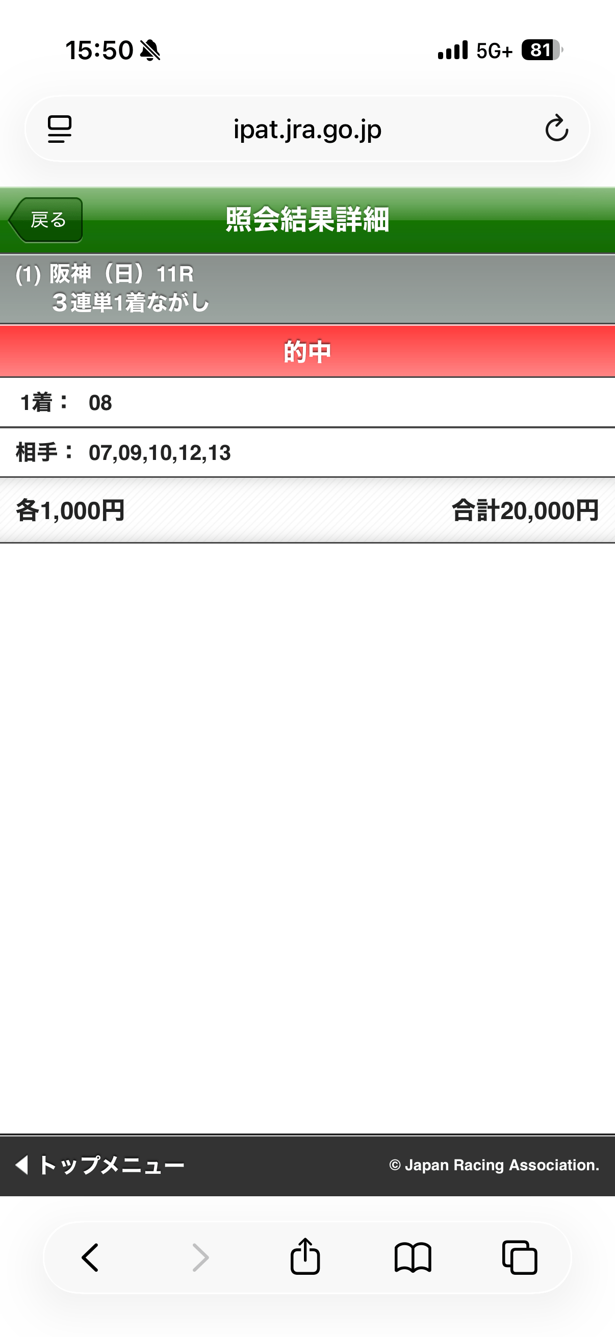 【即PAT的中画像公開】朝日杯FS(G1)7万5100円的中!