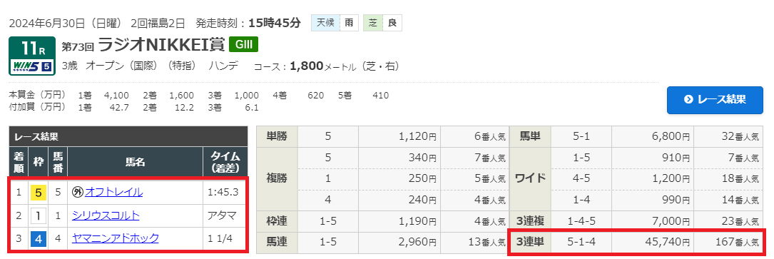 単勝4番人気の①シリウスコルトを軸にした3連単の予想でした。