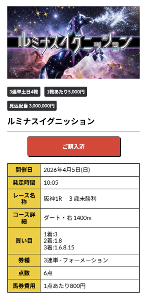 前日の雨が乾ききって無くて翌日の日曜日は重馬場表記でのレースでした。 そんな中公開された阪神1Rの予想は天地ひっくり返ったのかと思う8番人気を 3連単1着目完全固定。 新馬戦7着、未勝利戦も8着と勝ち切れてなかった馬の好走見抜いてました。 芝からダート替わりで勝ち負けあると情報掴んだのでしょうか。 朝から770.1倍(77,010円)的中で61万6080円もの高額入手できました!